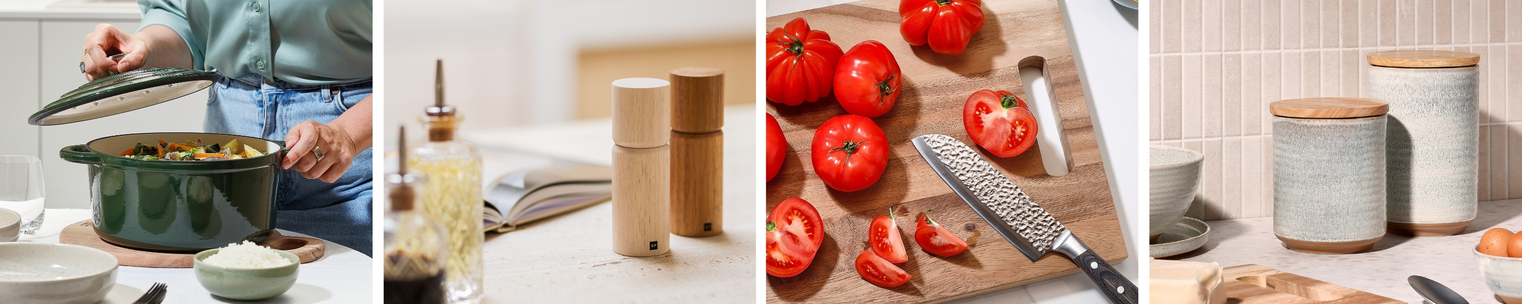 Wenn Ihre Mutter gerne kocht, wissen Sie, wie wichtig gutes Werkzeug und praktische Hilfsmittel in der Küche sind. Vom schönen Schneidebrett bis hin zu praktischen Utensilien - es geht um die Freude am Kochen. Für die Mutter, die jede Mahlzeit mit Liebe zubereitet, kann ein kleines Geschenk wie ein schöner Kochtopf oder ein praktischer Vorratstopf ihrer Küche das gewisse Extra verleihen. VVon links nach rechts: Ferno Kochtopf, Savor Pfeffer/Salzmühle, Slice Scheidebrett, Cameo Vorratsdose