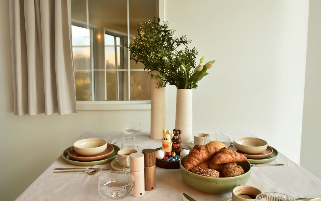 Du musst es nicht übertreiben. Ein paar frische Blumen, sanfte Farben und hochwertiges Geschirr schaffen im Nu die perfekte Osterstimmung. Schließlich geht es an Ostern vor allem um: gutes Essen, Zusammensein und Genießen.