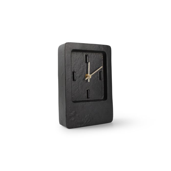 Our Zone clocks collection surprises with a new model that will never let us lose track of time again. This black variant has an elegant look due to its rectangular shape and is made of cast aluminium. The black colour is a perfect match with the golden hands. This table clock is ideal for any interior.Discover here how you can restore this clock when the hour hand is loose.