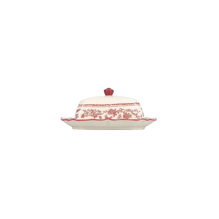 Ontdek de 20x14,5xH8,5cm bordeauxrode botervloot uit de Cyril collectie. Deze is vervaardigd uit verfijnd porselein en combineert vintage charme met een moderne uitstraling. Ideaal om boter stijlvol te serveren tijdens maaltijden thuis of op elegante feestjes. Een must-have voor liefhebbers van retro esthetiek.